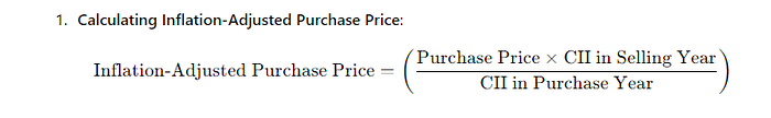 - Certainly! Suppose you bought a property in 2001 for Rs 1,00,000 and sold it in 2020 for Rs 4,00,000. With indexation, if the CII in 2001 was 100 and in 2020 it was 301, the inflation-adjusted purchase price would be Rs 3,01,000. The taxable capital gain would then be Rs 99,000 (4,00,000–3,01,000).